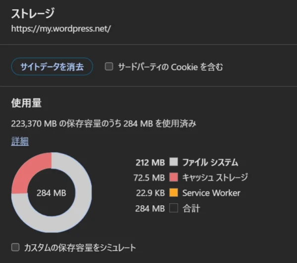 初回には WordPress 本体がブラウザにダウンロードされて、キャッシュストレージに保存される。PWA (ウェブアプリ) として動作するため、初回のダウンロードが終われば、オフラインでも動作する。保存容量の上限はデバイスとブラウザに依るが、普通の使用方法では不足することはないだろう。